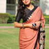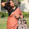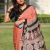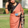 Ajrakh is most ancient art form traced around 5000 years old. It involves complicated hand-block printing method from Sindh (now in Pakistan), Kutch, Gujarat (India) using natural colors extracted from minerals, metals, camel dung and vegetables, fruits. Its motifs are inspired by nature like Sun, Plants and Stars and resembles geometrical shapes. It holds the legacy from Indus Valley Civilisation and evidence of Ajrakh is found in Mohenjodaro excavation as well. It undergoes 16 process in making a single piece of saree which takes around 15 to 21 days. Its natural Modal Fabric and pigments makes it ideal to wear in both summers and winters.