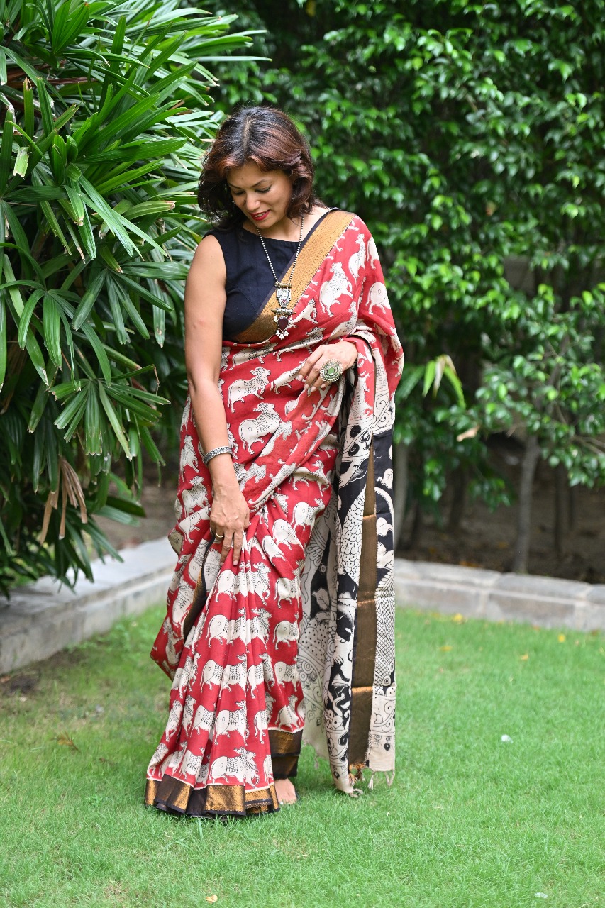 Step into timeless elegance with our Kalamkari Silk Saree, a perfect fusion of tradition and luxury. Handcrafted by skilled artisans, this saree showcases intricate Kalamkari motifs—each design narrating stories inspired by Indian heritage, nature, and mythology. The smooth silk fabric enhances its rich block-printed patterns, giving it a regal drape and an exquisite sheen. The saree has a thin woven zari border to add stylish definition.
